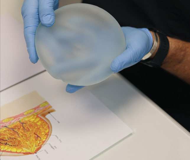 Textured implants have a rough surface that helps surrounding tissue to attach to them, perhaps reducing the risk of implant rotation. They are often used alongside anatomically shaped implants, such as gummy bear implants, to provide stability and shape retention within the breast pocket.
